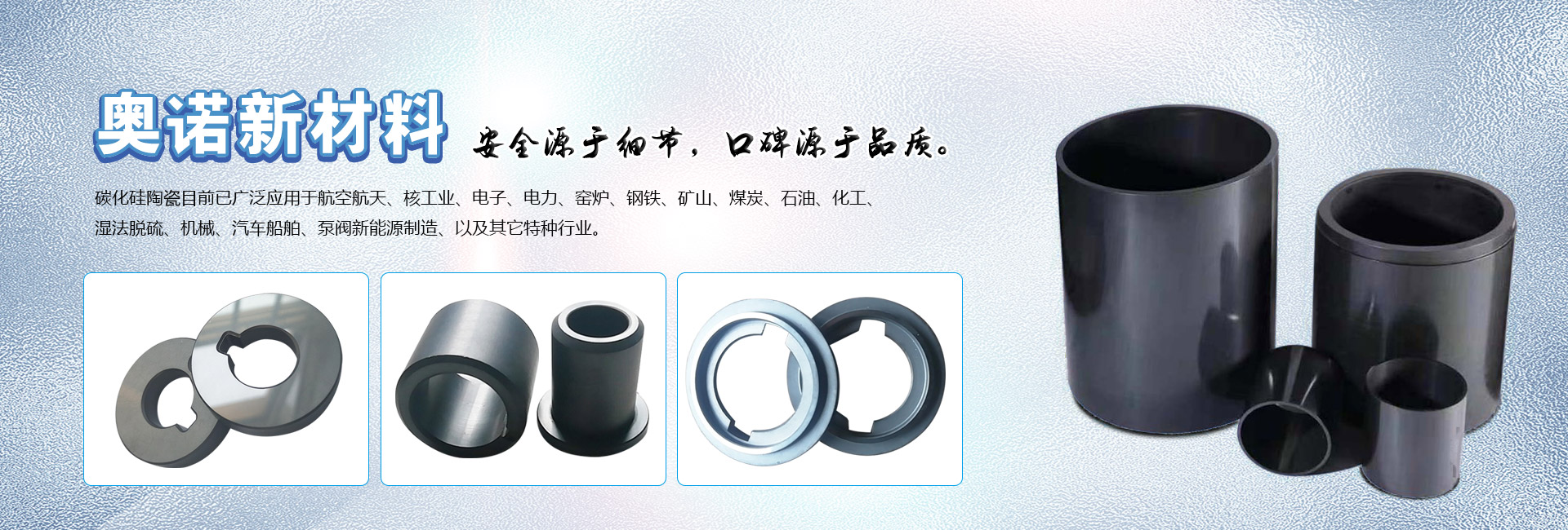 濰坊奧諾新材料有限公司坐落于美麗的山東半島中部風箏都濰坊市坊子區。公司主要以研發生產經營:無壓燒結碳化硅陶瓷、反應燒結碳化硅陶瓷、碳化硅微粉及其它陶瓷制品、耐火材料等系列產品。 碳化硅陶瓷具有高強度、高硬度、高耐磨、耐腐蝕、耐高溫、抗氧化、耐急冷急熱、抗熱震性好、導熱好和熱效率高等基本性能和主要特點,是工業陶瓷領域性能最好的產品之一。 碳化硅陶瓷目前已廣泛應用于航空航天、核工業、電子、電力、窯爐、鋼鐵、礦山、煤炭、石油、化工、濕法脫硫、機械、汽車船舶、泵閥新能源制造、以及其它特種行業。公司擁有文化程度高、專業知識強、富有經驗的技術團隊,現場售后服務團隊和銷售團隊遍布全國各地。